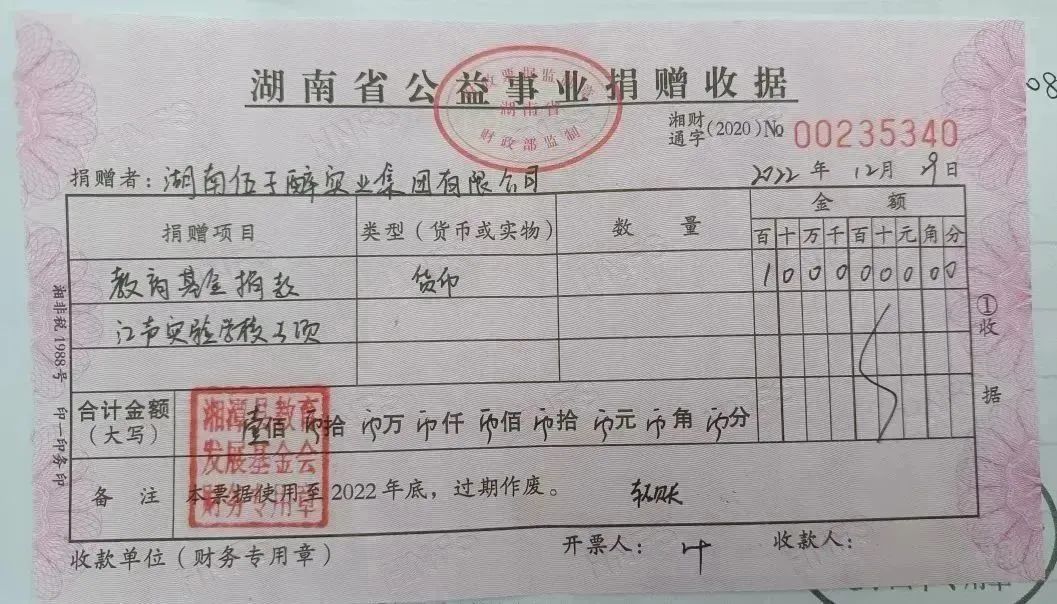 為光大蓮鄉教育品牌,助推江聲穩步發展,自2022年12月14日湘潭江聲教育發展基金舉行捐資助學認捐儀式后,愛心企業紛紛向基金注入資金。2022年12月29日,湖南伍子醉實業集團有限公司捐助的一百萬元匯入了江聲教育發展基金會的賬戶。
